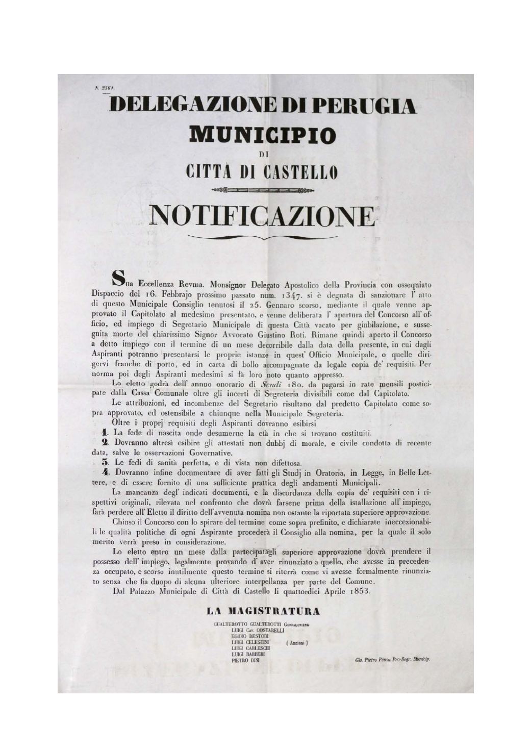 1853 ‐ Bando concorso Segretario Comunale di Città di Castello